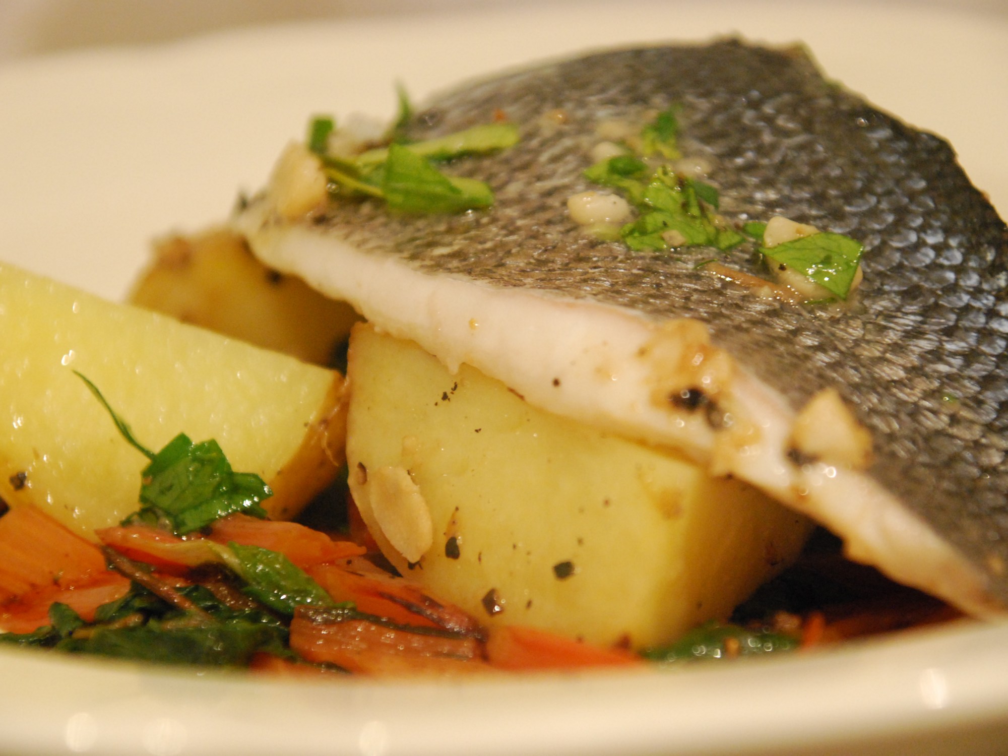 Sea Bass with Garlic, Lemon, Potatoes and Rainbow Chard